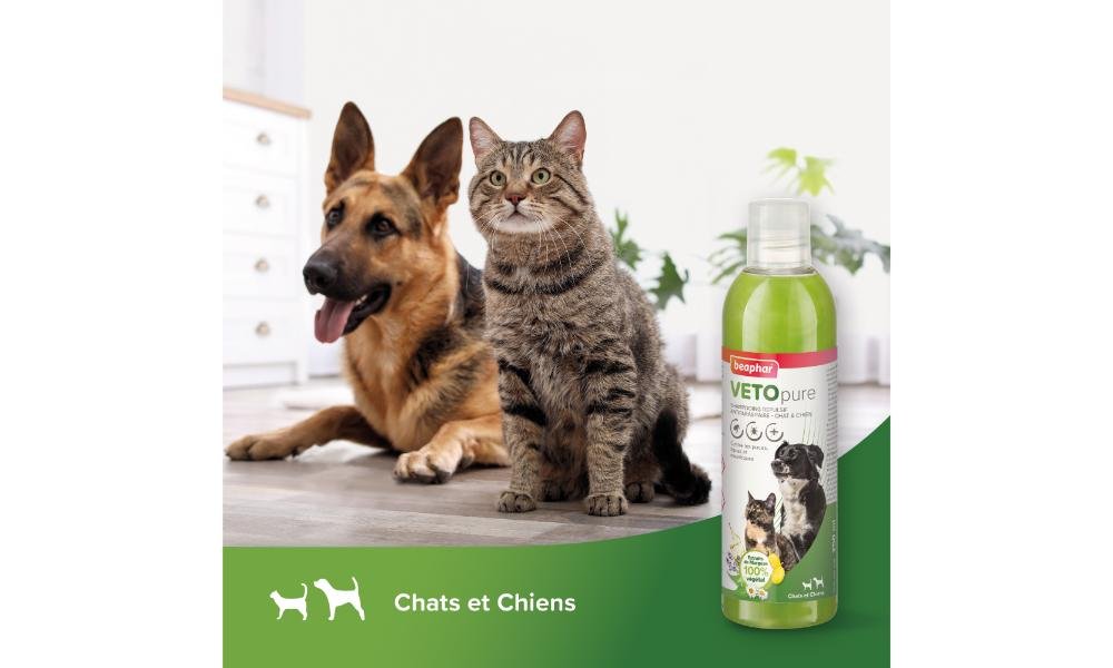 Beaphar BIO Veto pure 100% ნატურალური შამპუნი გარე პარაზიტებით ინფიცირებული ძაღლებისა და კატებისთვის. შეიცავს მარგოზას, ციტრონელას და ლავანდის ზეთებს, რომლებსაც აქვთ ინსექტიციდური თვისებები და აქვთ სასარგებლო ეფექტი კანზე. შამპუნის წასმის შემდეგ ზეთები ვრცელდება ცხოველის კანსა და ბეწვზე. ის იწყებს მოქმედებას გამოყენებისთანავე, აცილებს პარაზიტებს, ასუფთავებს თმას და კანს და ამცირებს ქავილს.