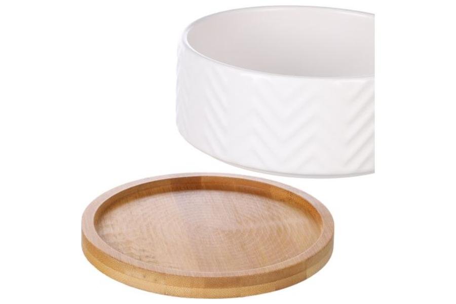 კერამიკის თასი ბამბუკის სადგამით თეთრი – ზომა: A:16,1სმ B:6,6სმ C:7,7სმD:16სმ – 990მმ / Feeding and drinking bowl Bianco Round White size: A:16,1cm B:6,6cm C:7,7cm D:16cm – 990ml