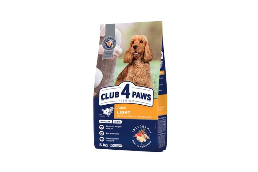 CLUB 4 PAWS პრემიუმ მსუბუქი. სრული მშრალი საკვები წონის კონტროლისთვის საშუალო და დიდი ჯიშის ზრდასრული ძაღლებისთვის, რომლებიც სტერილიზებულია ან მიდრეკილნი არიან ჭარბი წონისკენ. მდიდარია ინდაურით.