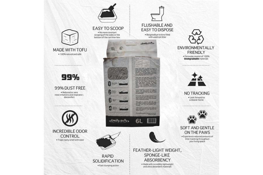 Emily Pets “Tofu”- ს მწვანე ჩაის ქვიშა სოიოსგან მზადდება. გრანულები არ ეკვრის თათებს, ბეწვს და ამავდროულად მაქსიმალურად შთანთქავს ტენიანობას და სუნს. ქვიშას ასევე აქვს ანტისეპტიკური თვისებები რაც საშუალებას გაძლევთ შექმნათ კომფორტული გარემო თქვენი შინაური ცხოველებისთვის.
