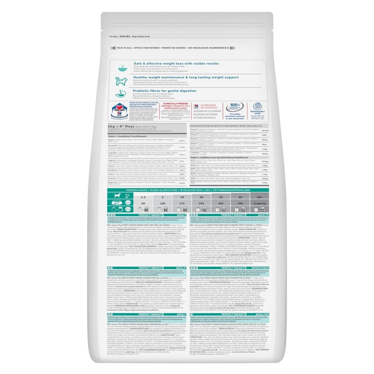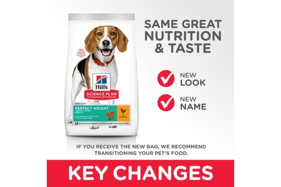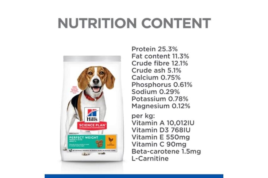 Hill’s Science Plan Perfect Weight ზრდასრული ძაღლის საკვები ქათმით არის გემრიელი, კლინიკურად დადასტურებული საკვები ოპტიმალური წონის მისაღწევად და შესანარჩუნებლად. ჩვენი მაღალი ცილოვანი, ბოჭკოვანი ფორმულა, გამდიდრებული L-კარნიტინით და ქოქოსის ზეთით, ეხმარება ძაღლების მეტაბოლიზმს.