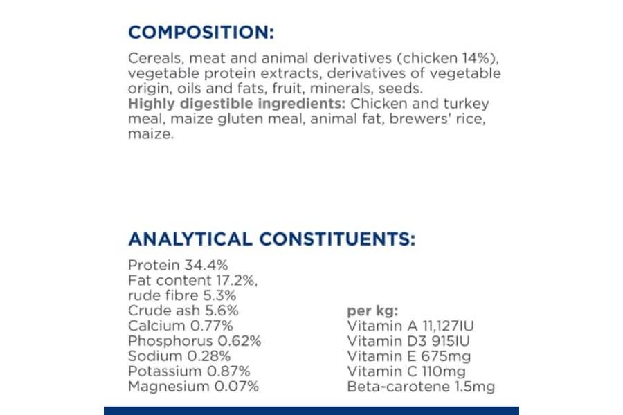 შემადგენლობა: მარცვლეული, ხორცი და ცხოველური პროდუქტები (ქათამი 14%), მცენარეული ცილების ექსტრაქტები, მცენარეული ქვეპროდუქტები, ზეთები და ცხიმები, ხილი, მინერალები, თესლი. ActivBiome+ პრებიოტიკური ბოჭკოების ნაზავი (9.6%): დაფქული პეკანის ნაჭუჭები, ხმელი ჭარხლის რბილობი, სელის თესლი, ხმელი ციტრუსის რბილობი, ხმელი მოცვი. ძალიან ათვისებადი ინგრედიენტები: ქათმის და ინდაურის კერძი, სიმინდის გლუტენის ფქვილი, ცხოველური ცხიმები, გატეხილი ბრინჯი, სიმინდი.